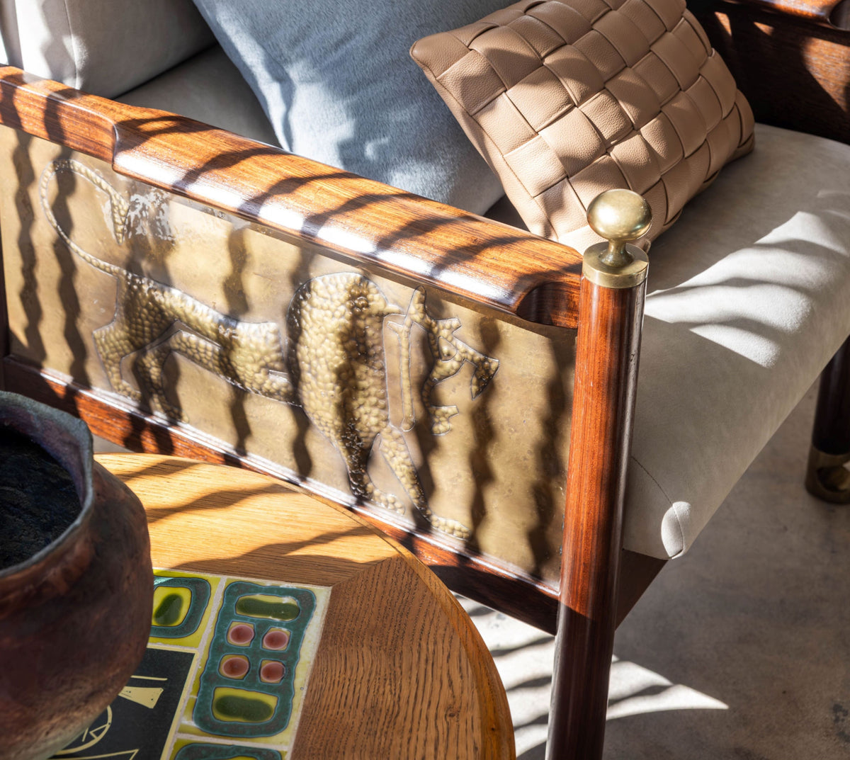 Brutalist frame chair with a patchwork leather backrest and seat cushion, paired