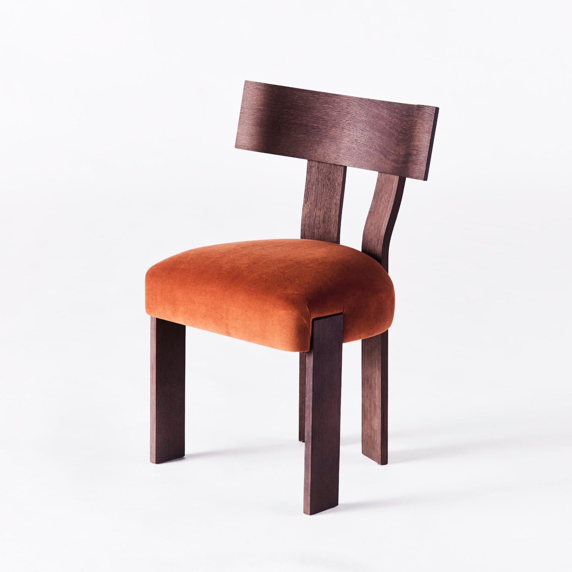 Alba Chair Velvet features a chunky, yet elegant shape. The base made of dark stained oak consists of straight, angular legs and a curved, generous backrest. The softly shaped seat is upholstered and covered with a velvet fabric which adds extra comfort to the chair.