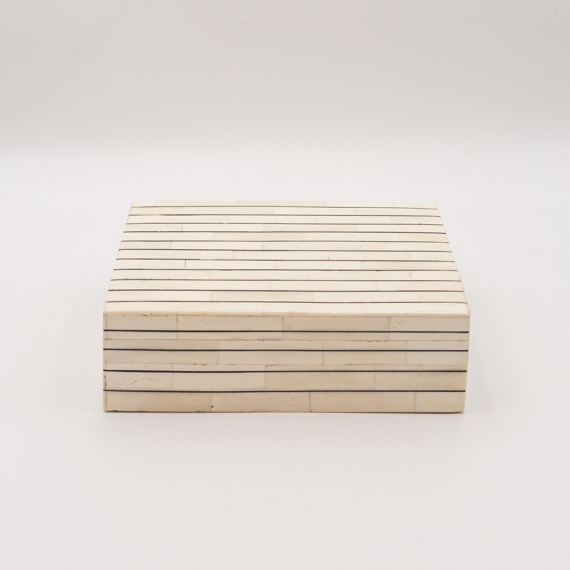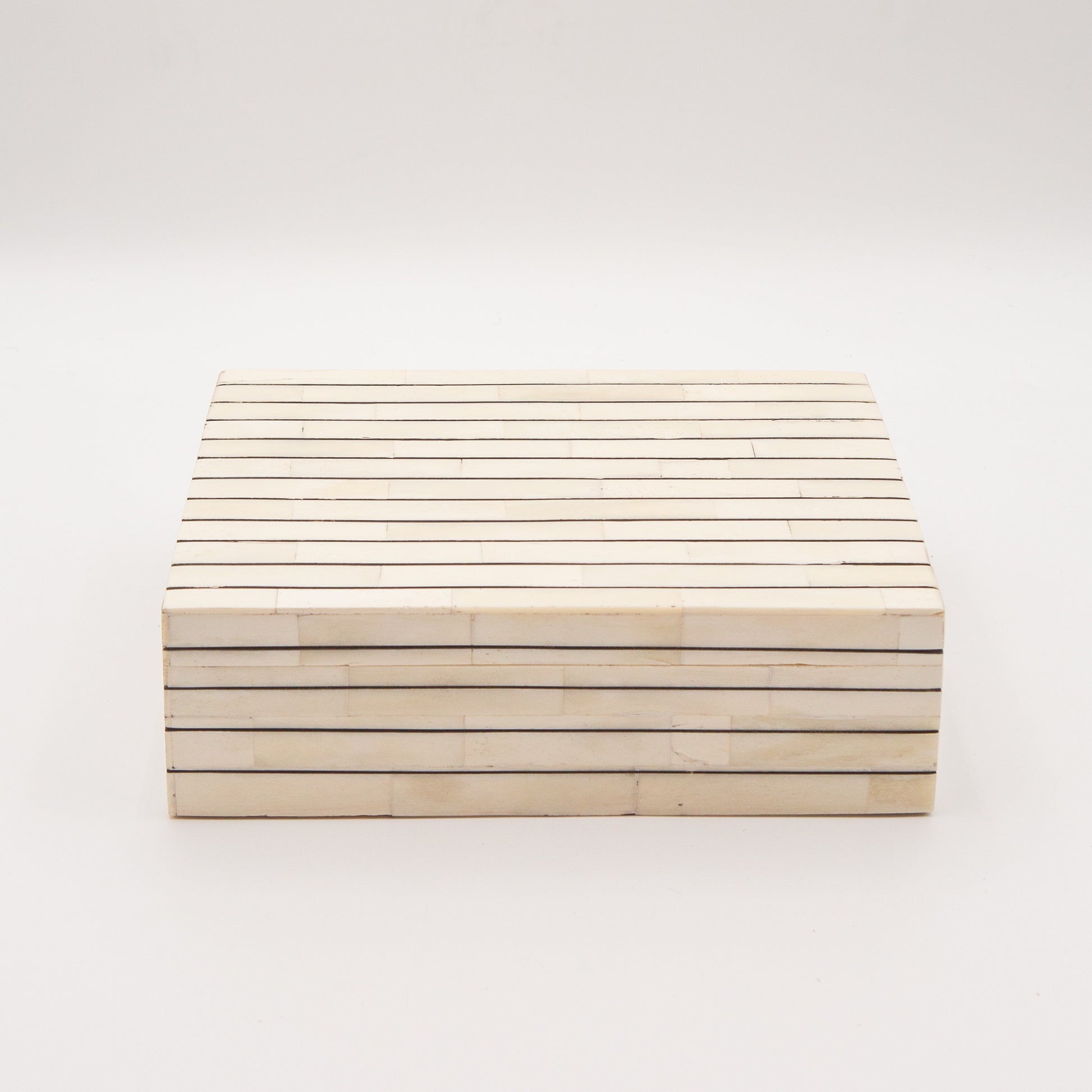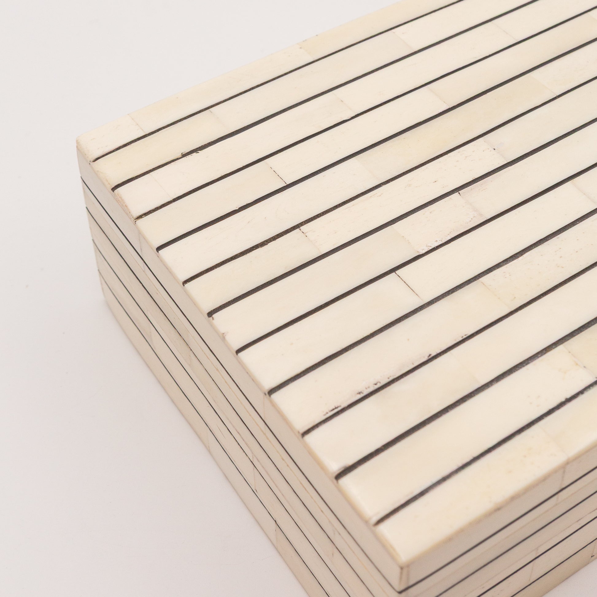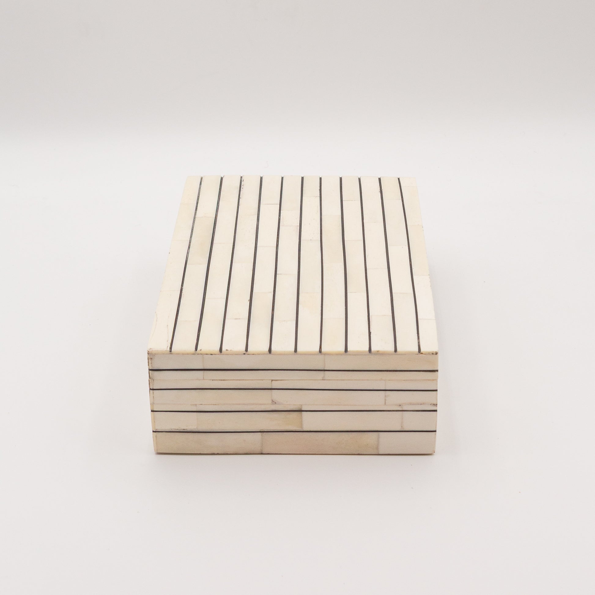 Ivory bone inlay decorative lidded box with ebony pinstripe design, handmade in the Valley of the Himalayas.