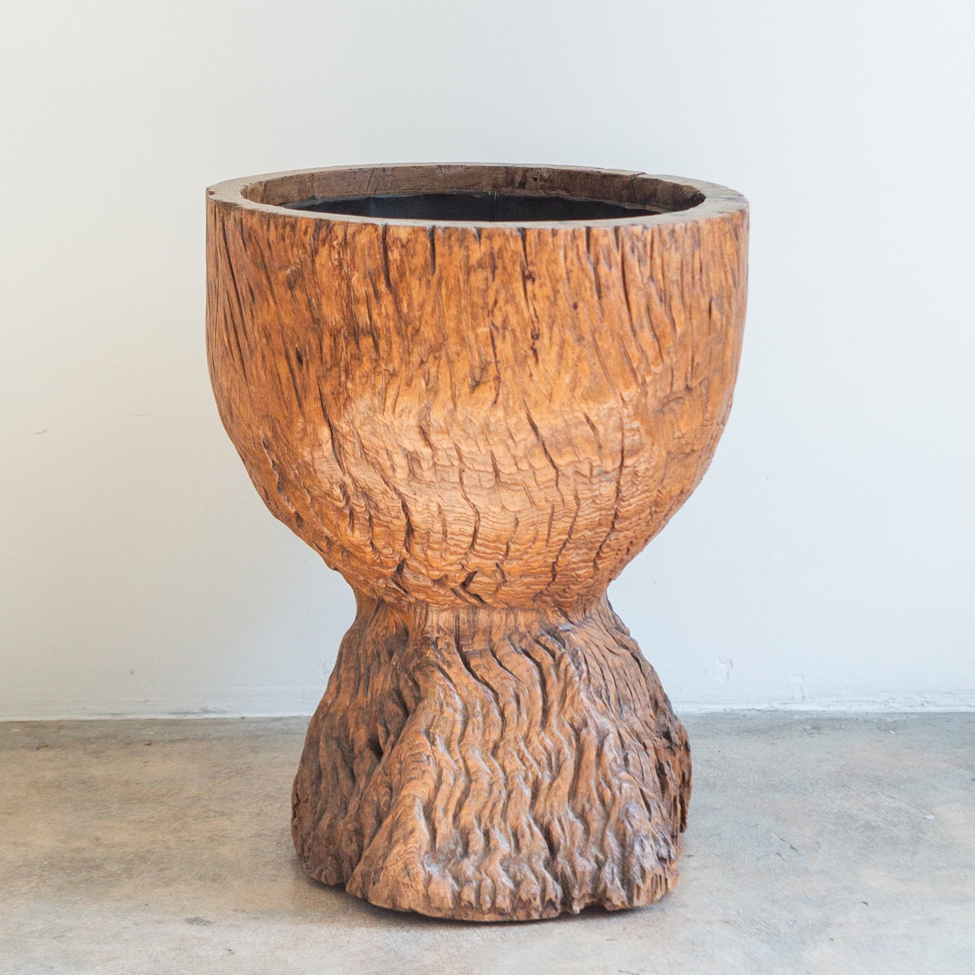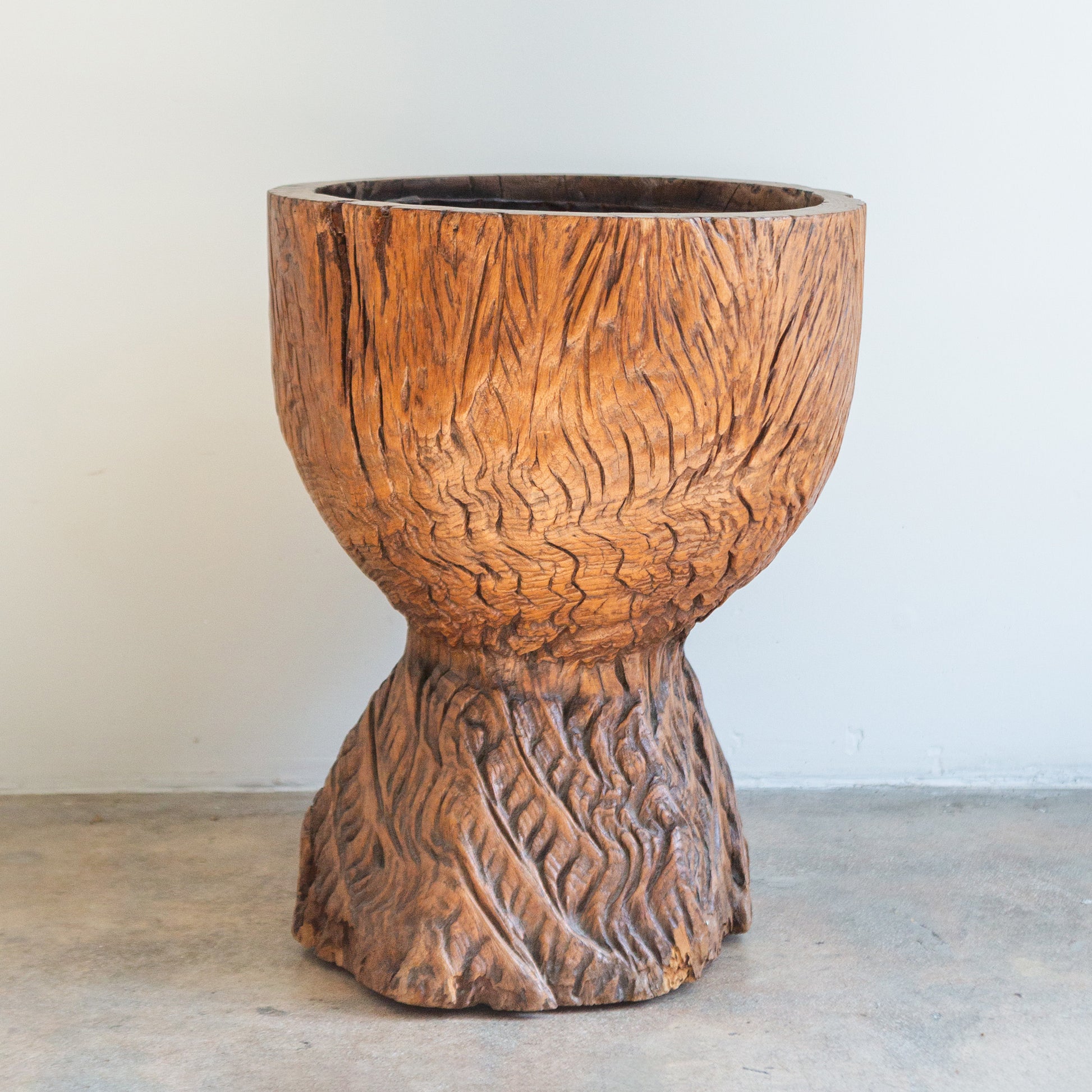 Carved pedestal planter made of burlwood root.