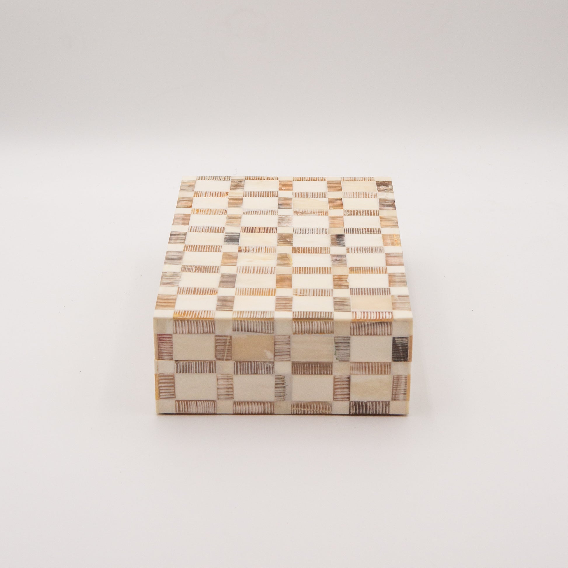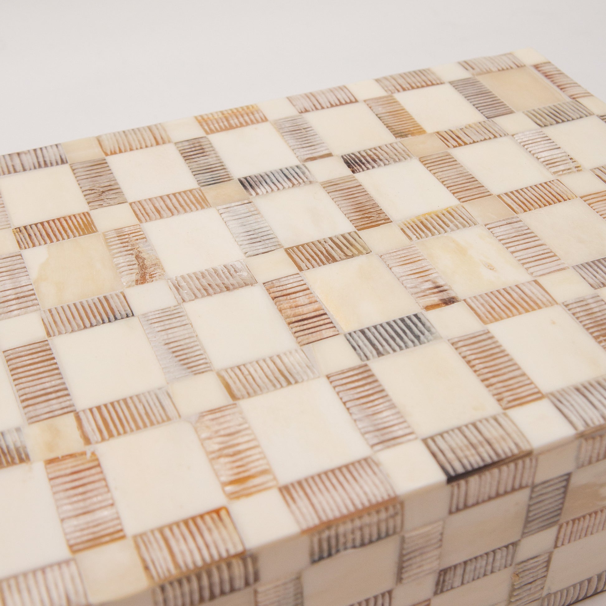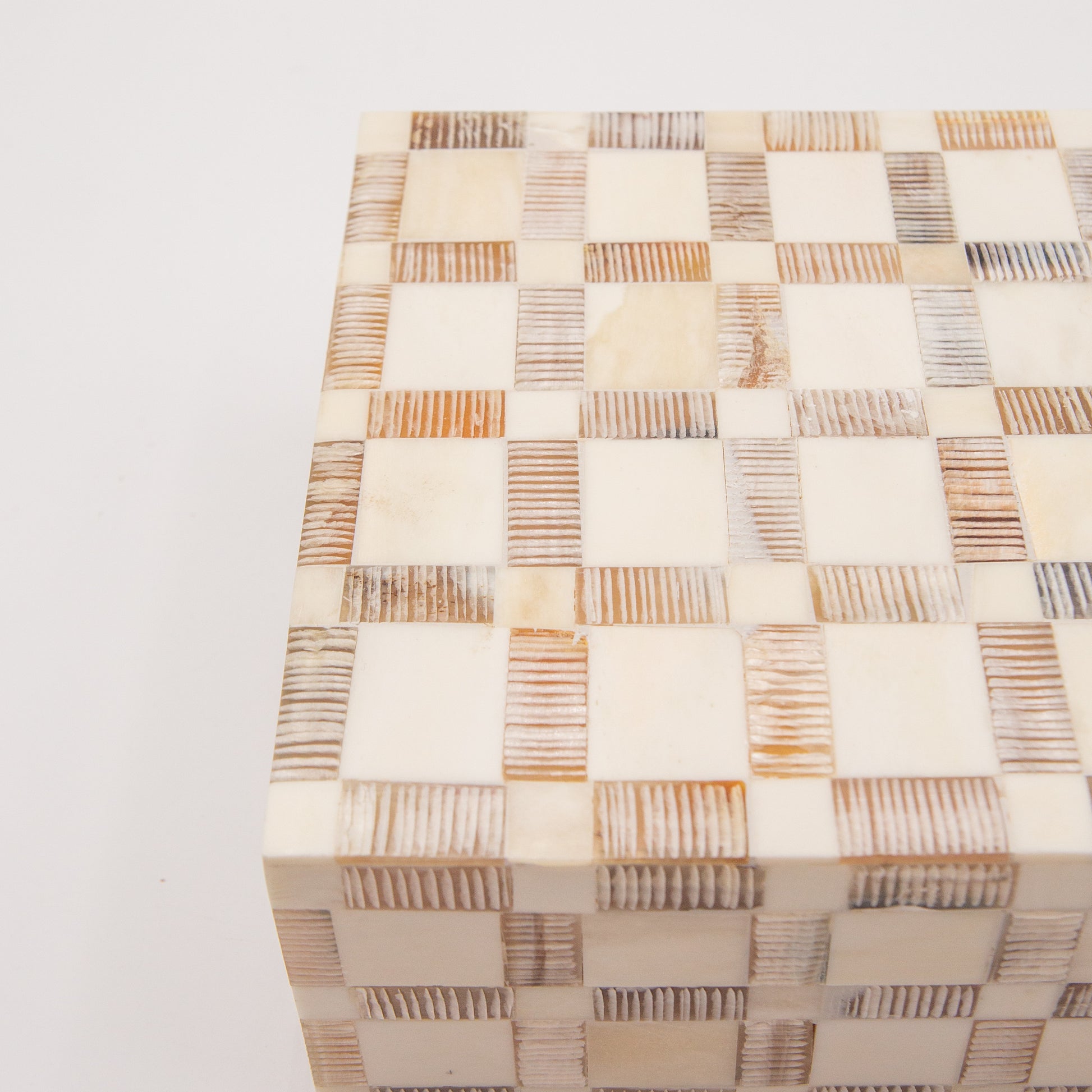 Ivory and grey bone checkered pattern inlay decorative lidded box, handmade in the Valley of the Himalayas.