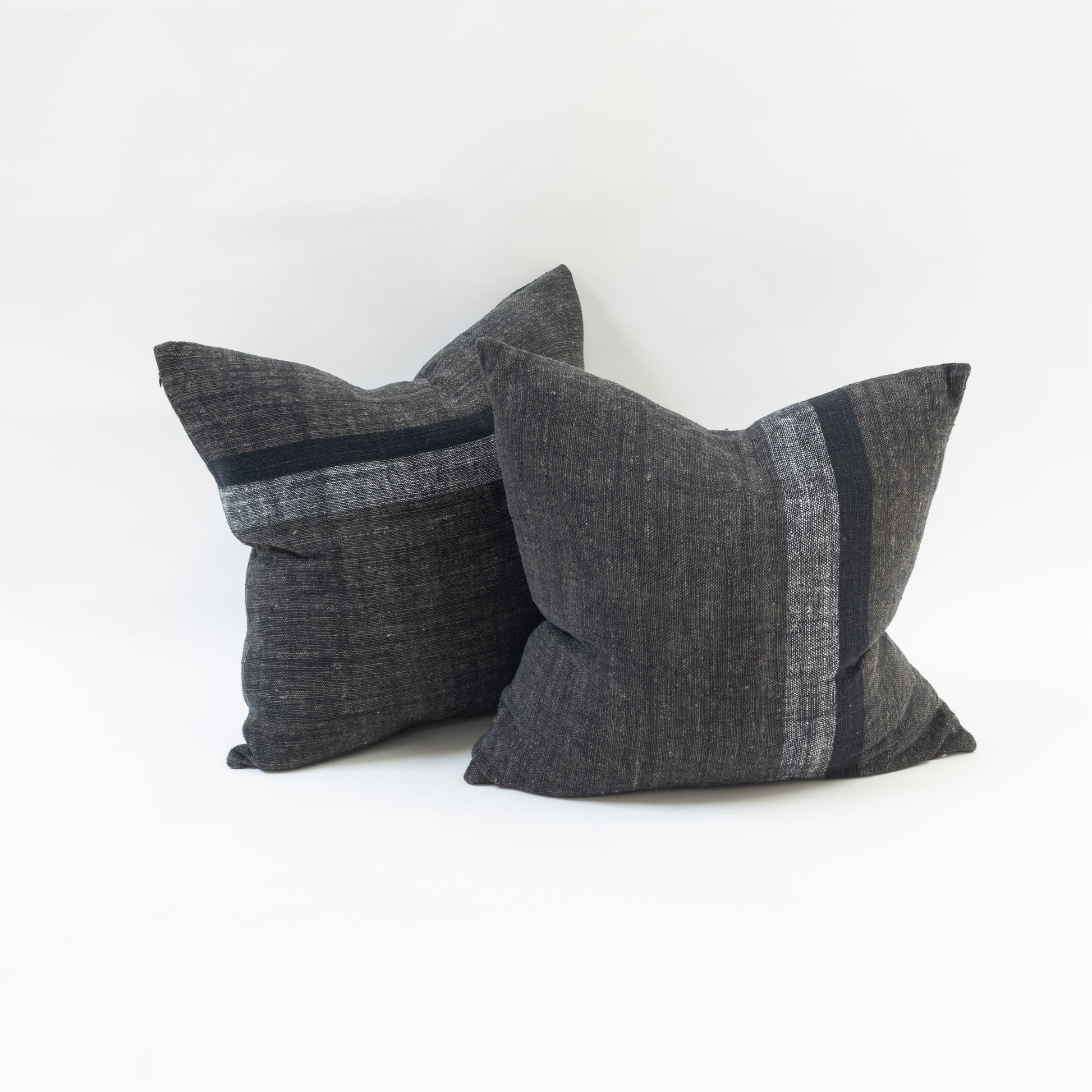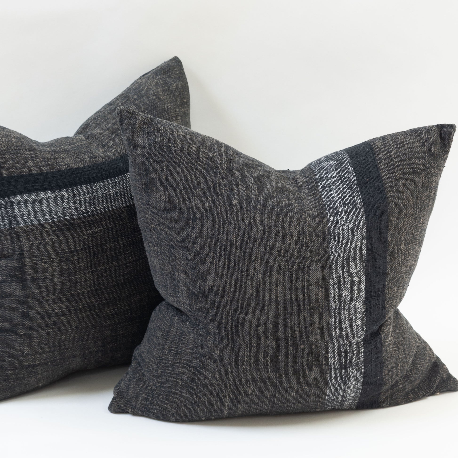 Handwoven pillow cover in dark brown, black and gray stripes made from handspun, botanical hand-dyed raw cotton yarns with zipper closure. Includes insert.