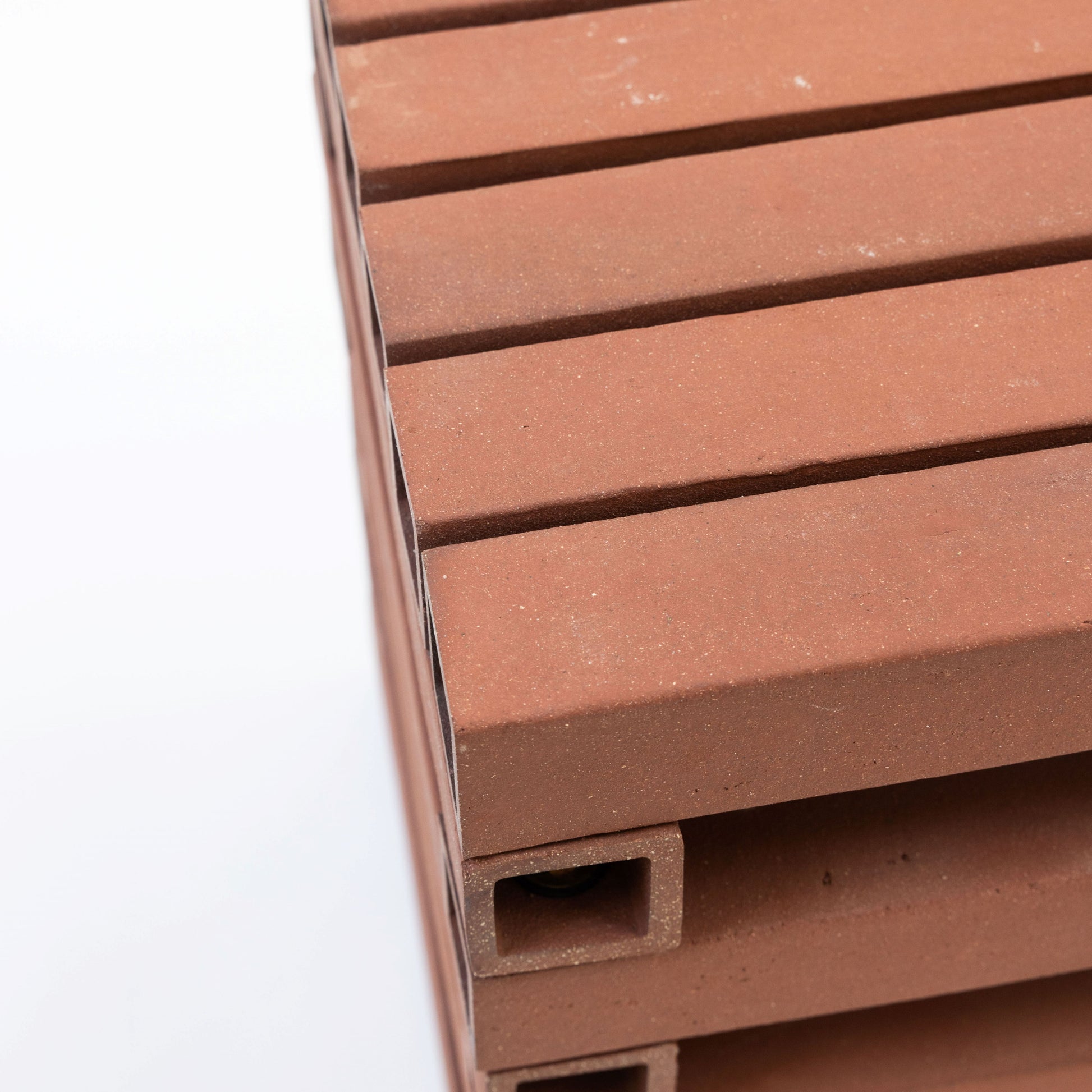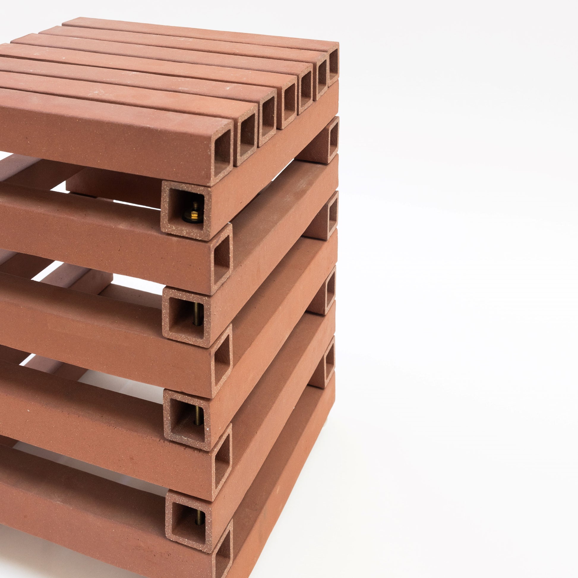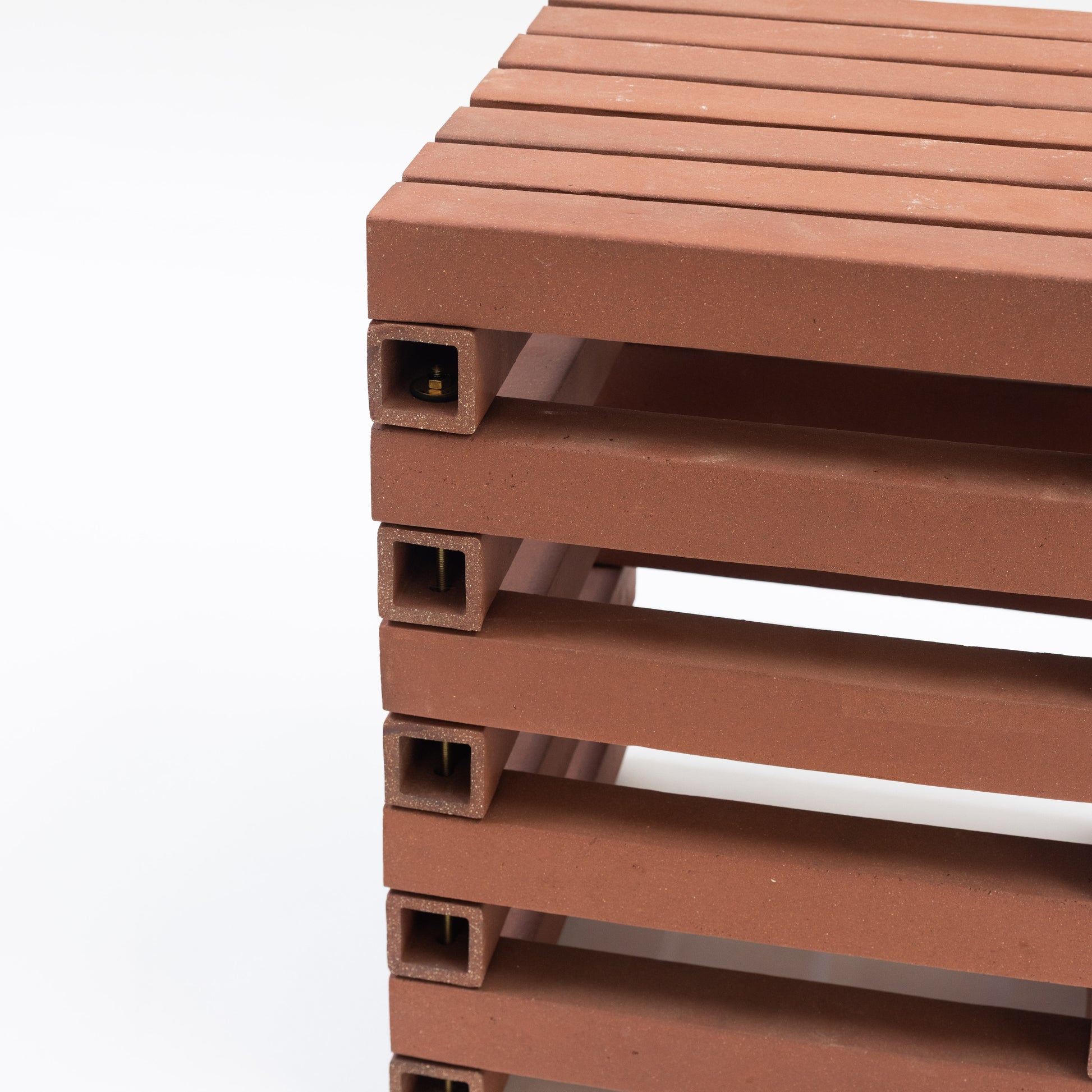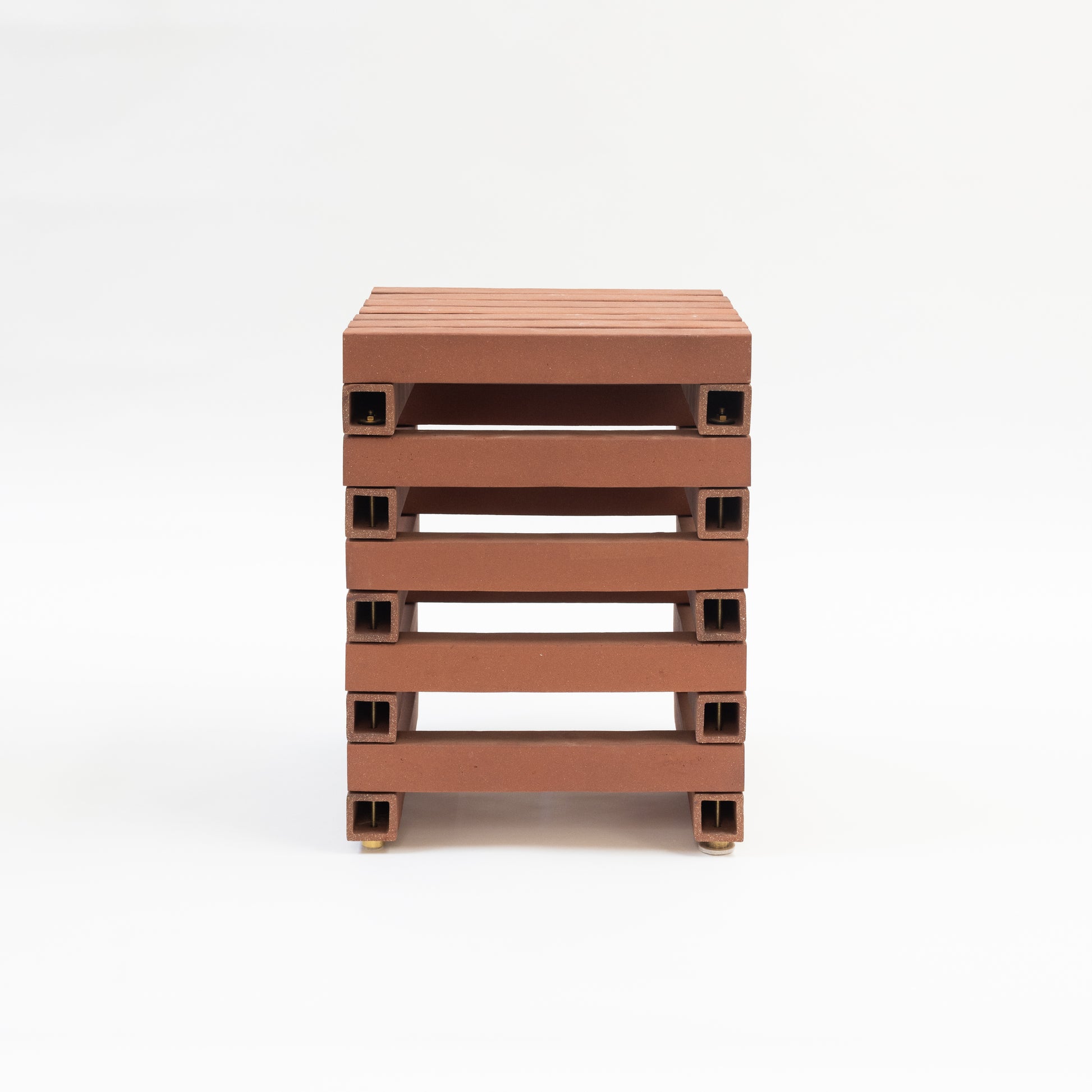 Unique handmade Toobiture side table made from extruded dark terracotta Toobs and brass fittings, by Los Angeles artist, Henry Kim of Hyunuko Studio.