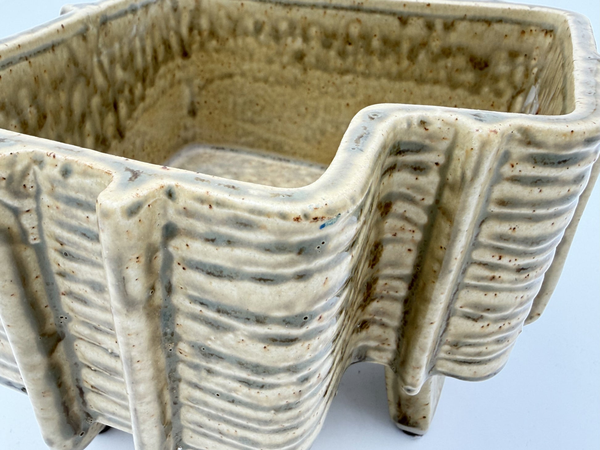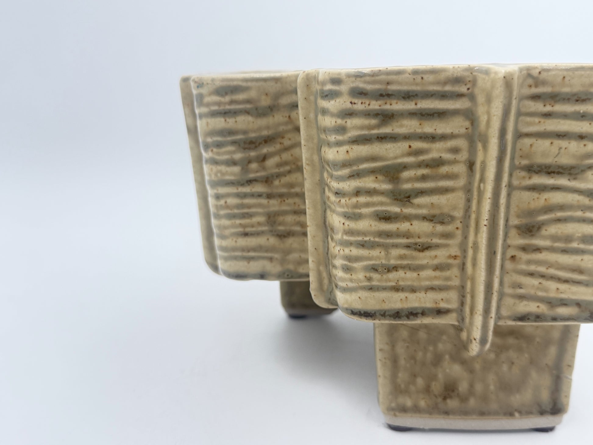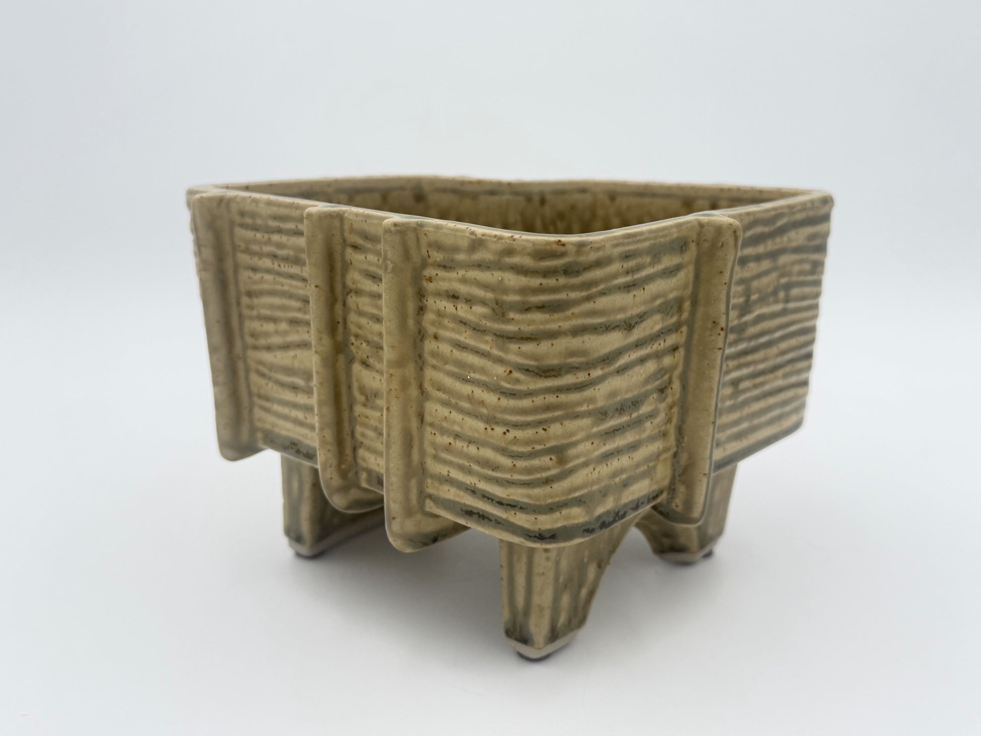 Sculptural Japanese ikebana ceramic footed planter with ribbed relief detailing and a speckled natural glaze.