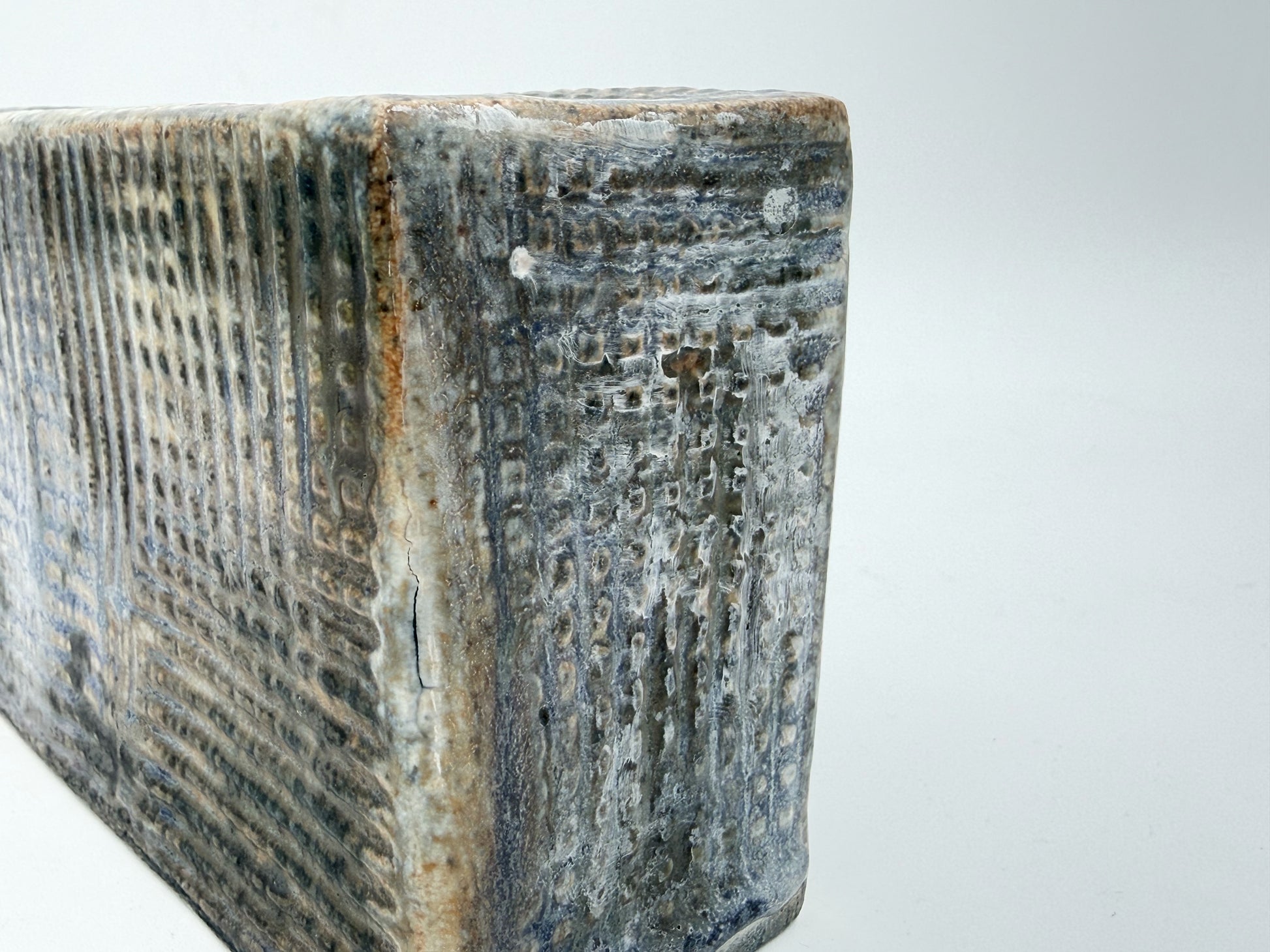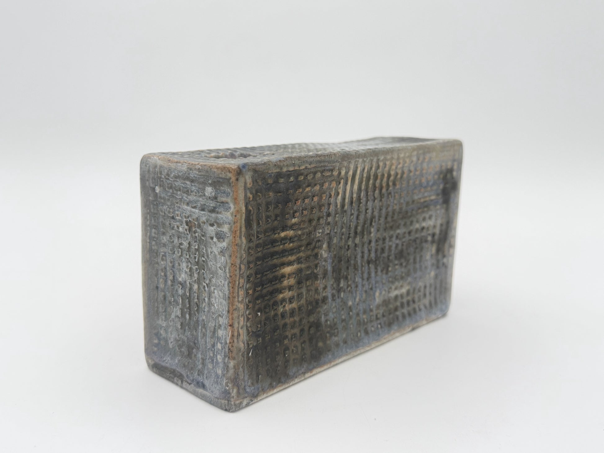 Japanese studio pottery with a rectangular form, richly textured incised pattern, and finished in a variegated blue-gray glaze.