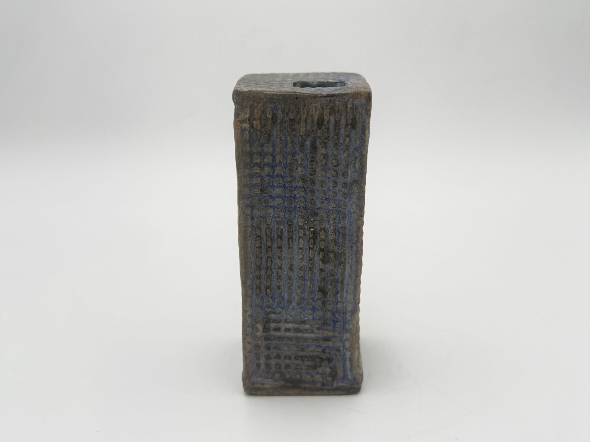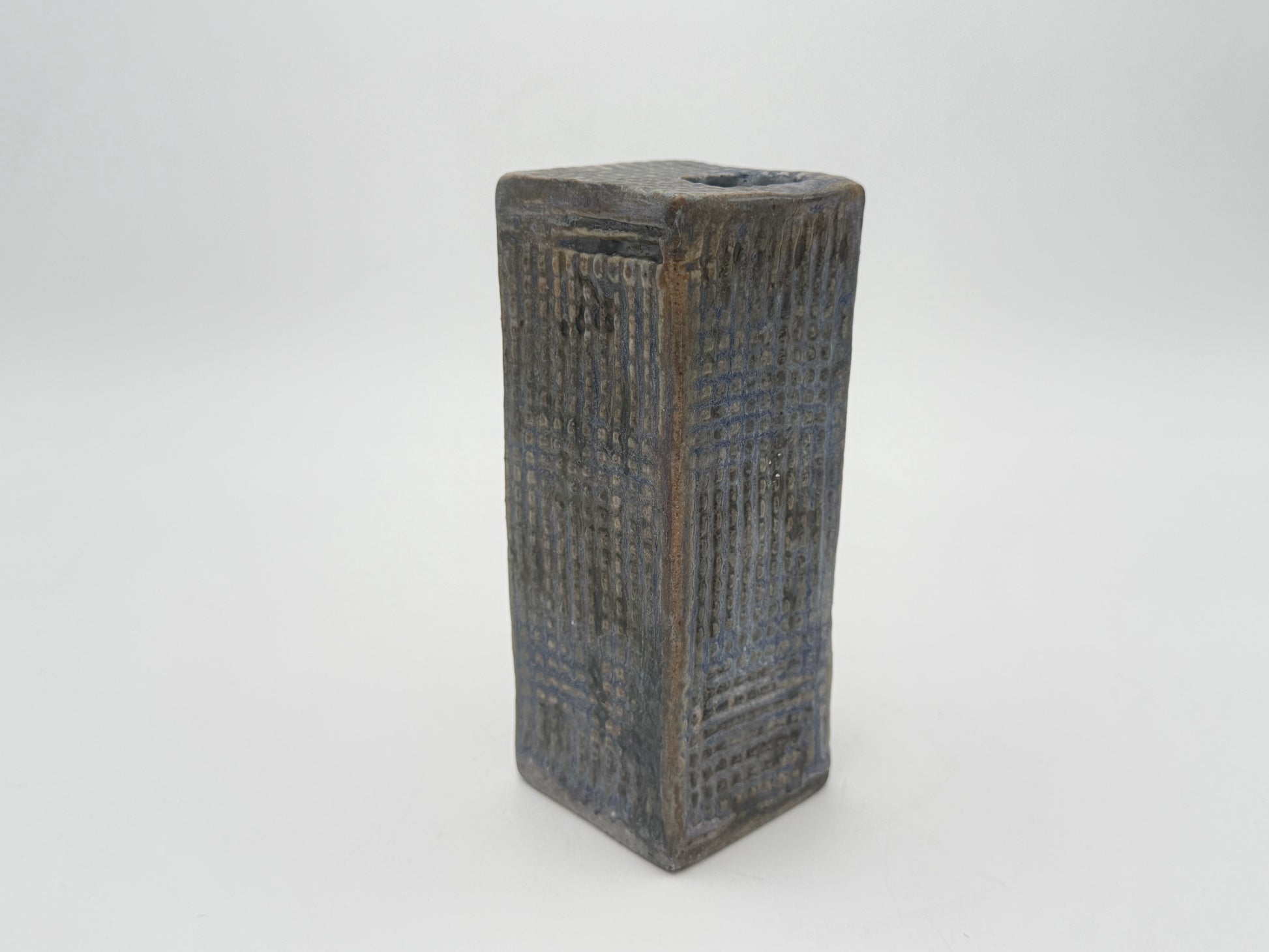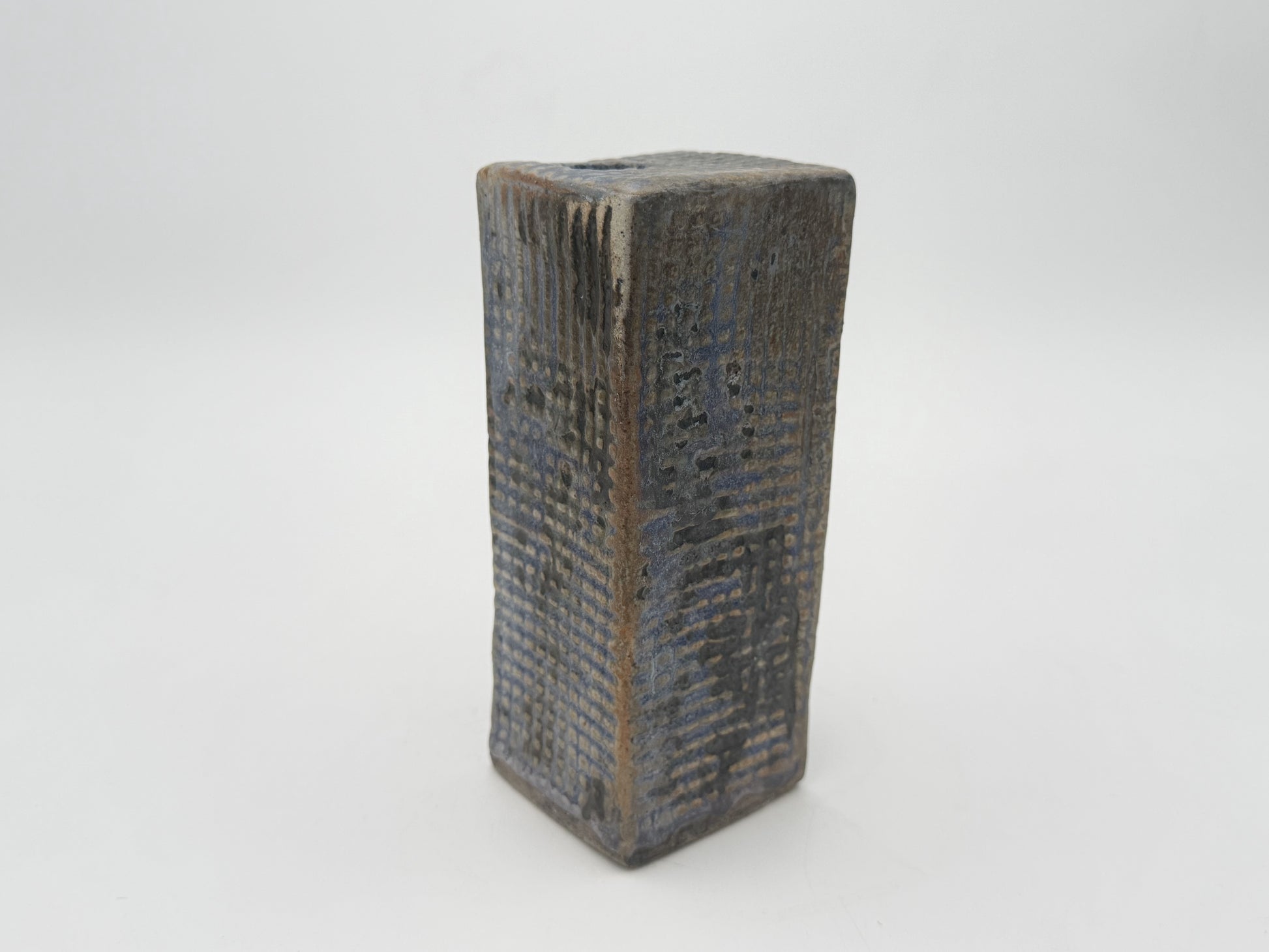 Japanese studio pottery with a rectangular form, richly textured incised pattern, and finished in a variegated blue-gray glaze.