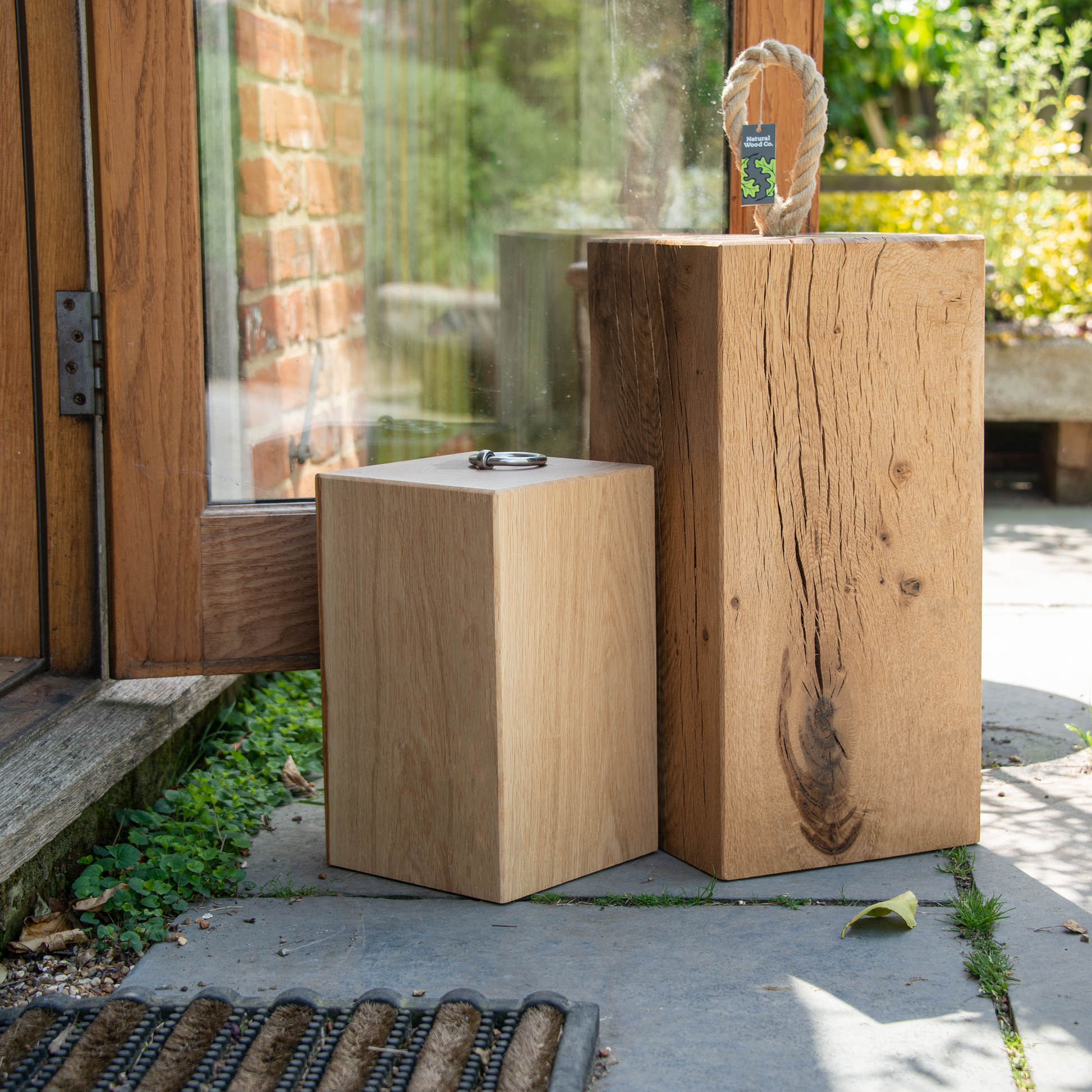 Kiln dried English oak block doorstop with rope handle.