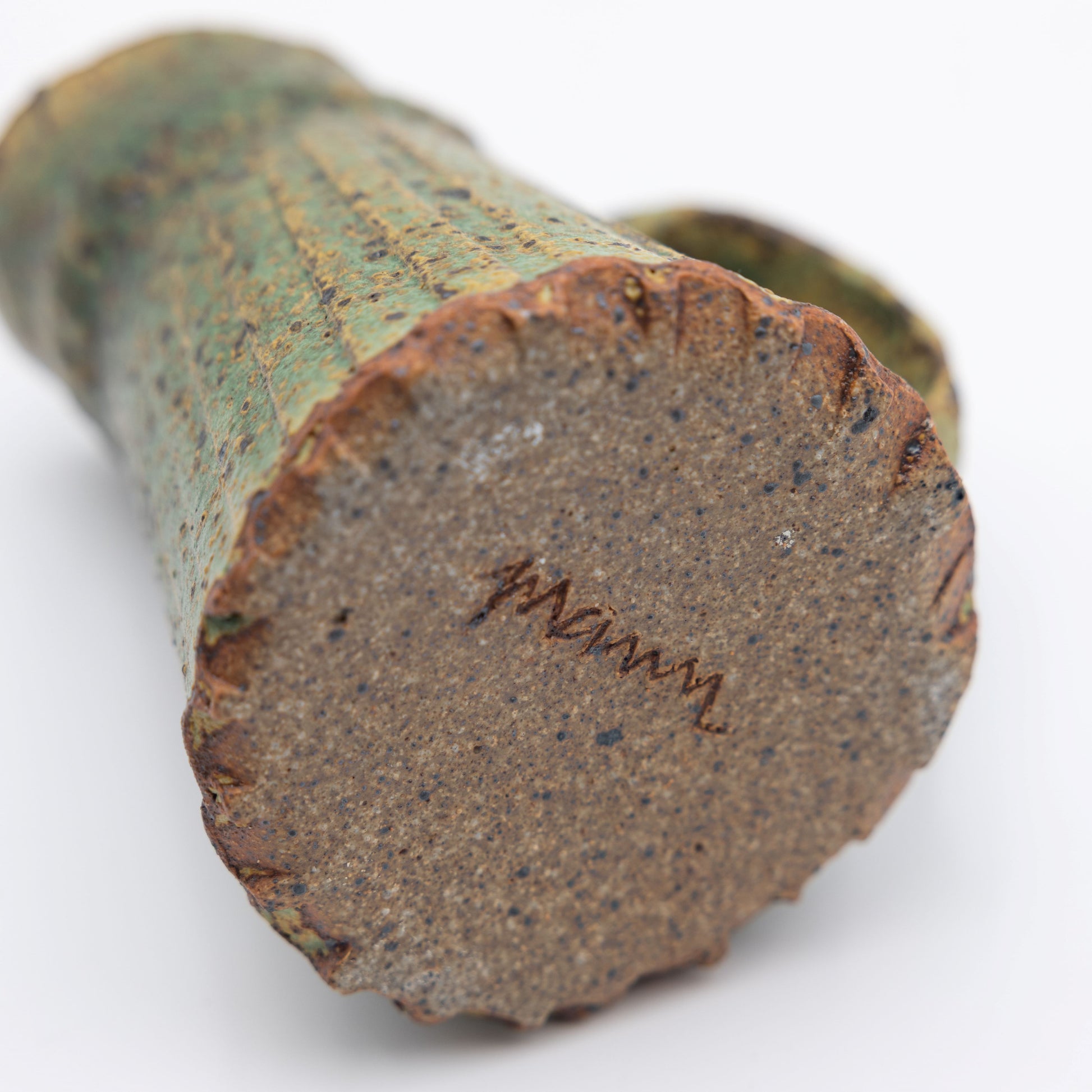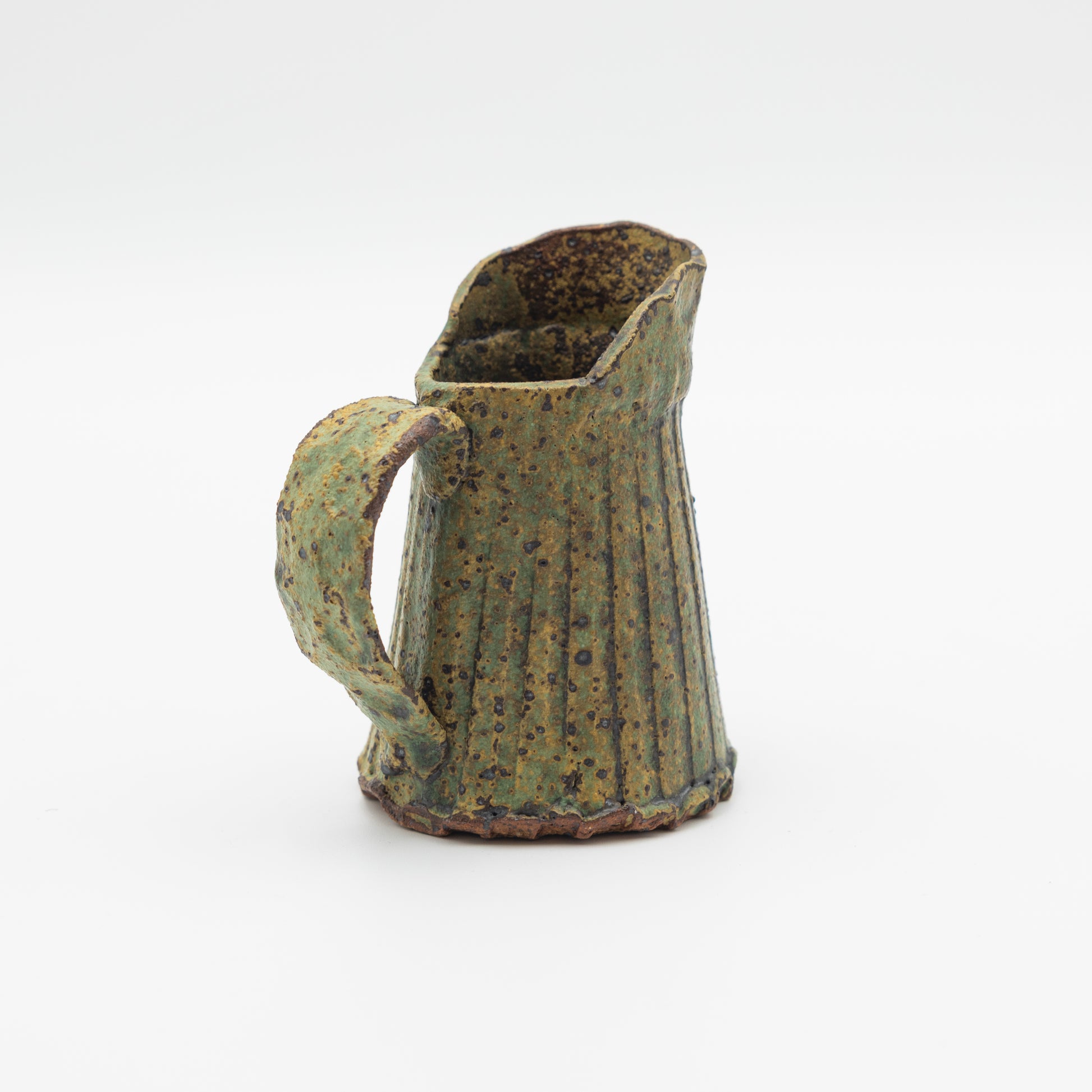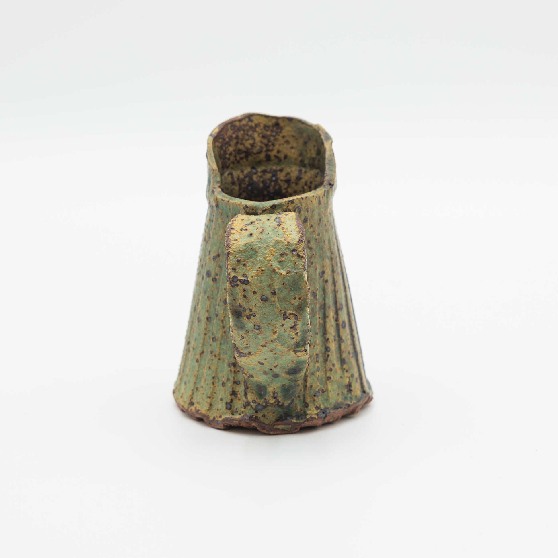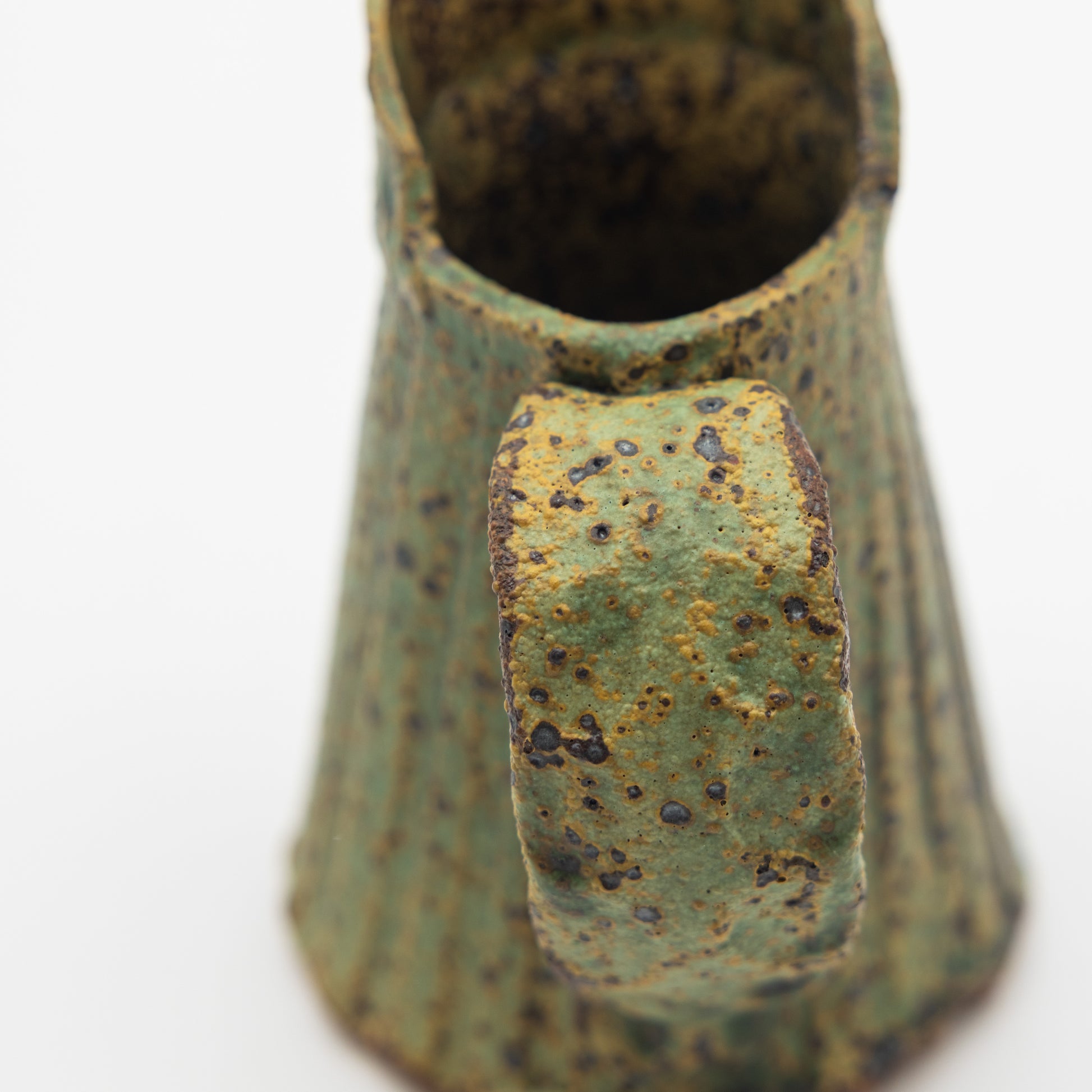 Small rustic green stoneware pitcher with handle and ribbed body by Los Angles ceramicist Sharon Mann.