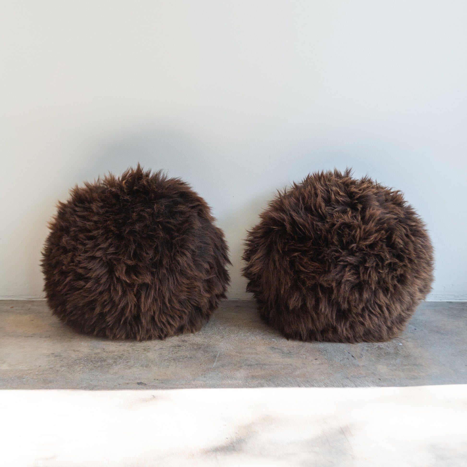 Round brown sheepskin pillow filled with sheepskin offcuts.