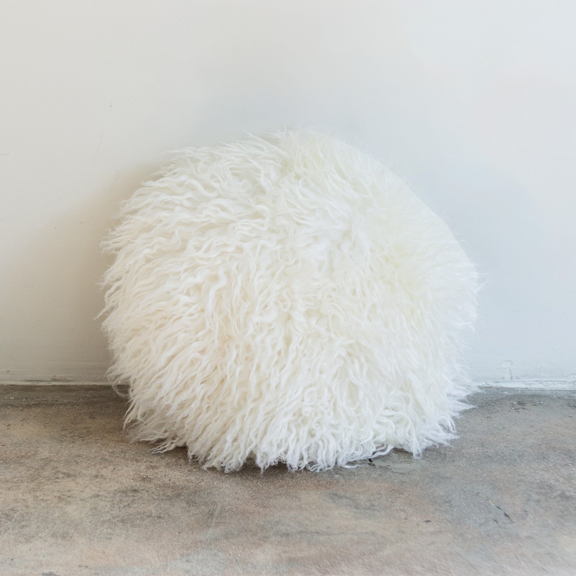 Round cream sheepskin pillow filled with sheepskin offcuts.
