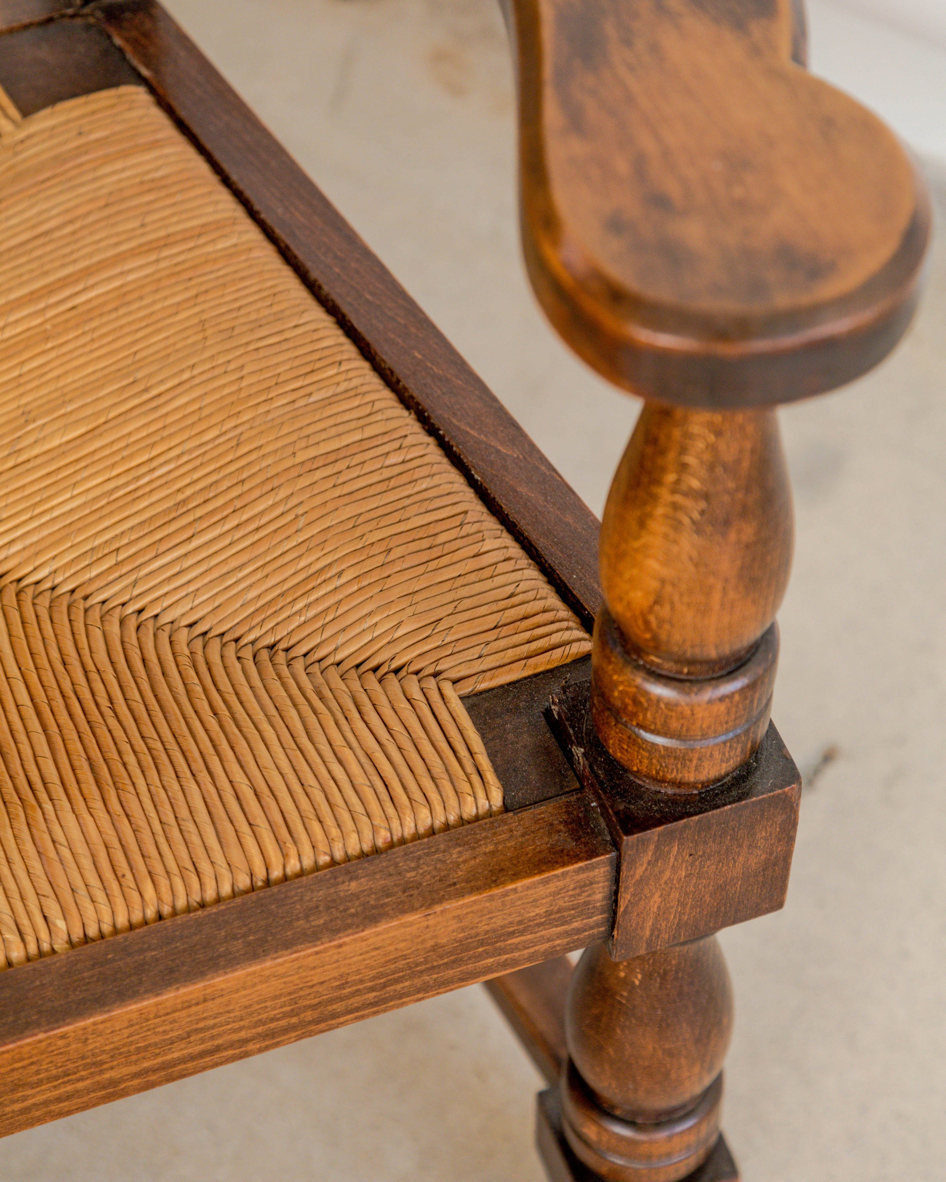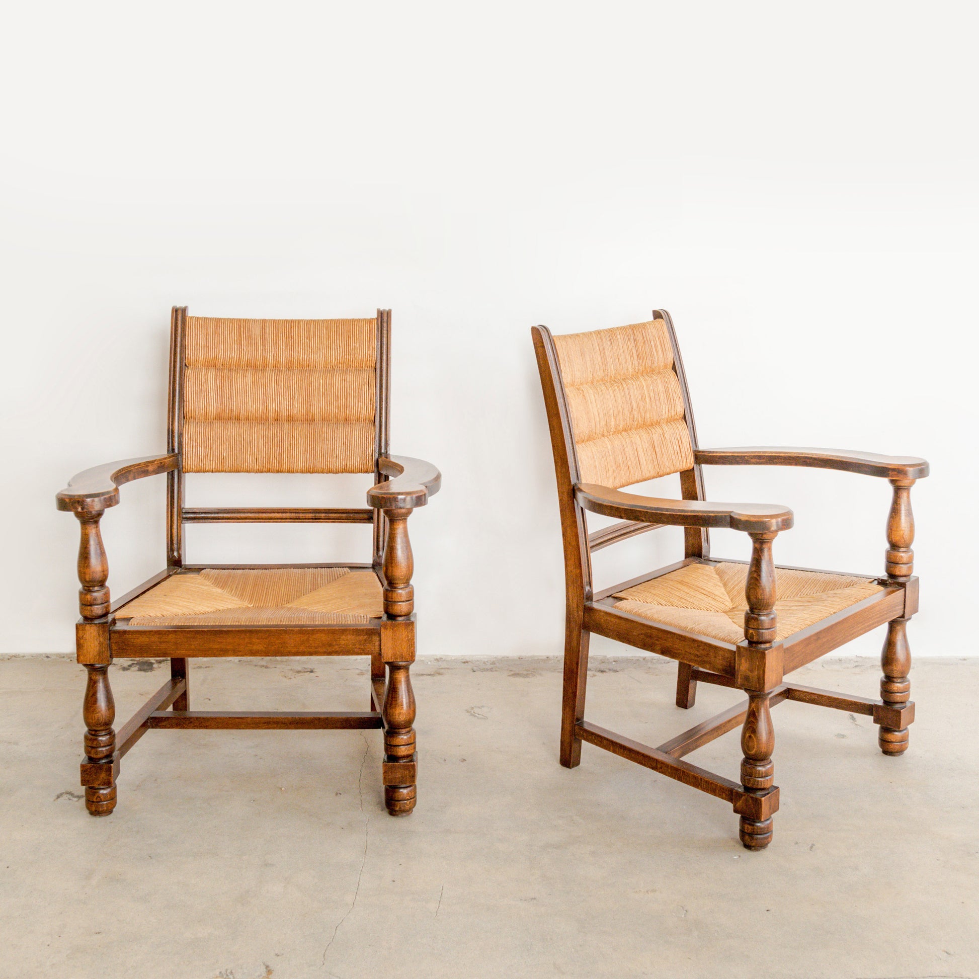 Pair of turned chestnut frame and rush armchairs, for the city or the country, France circa, 1940's.