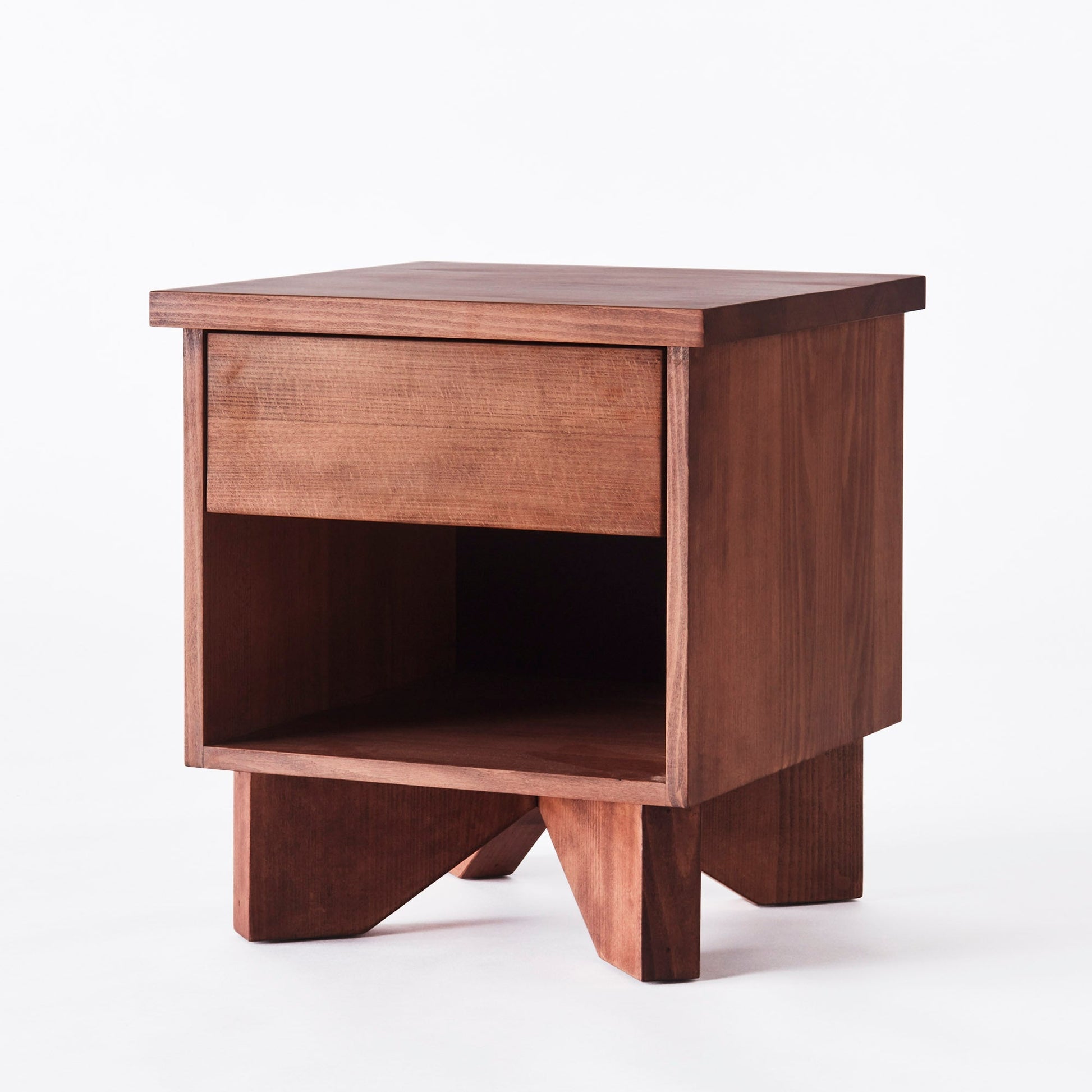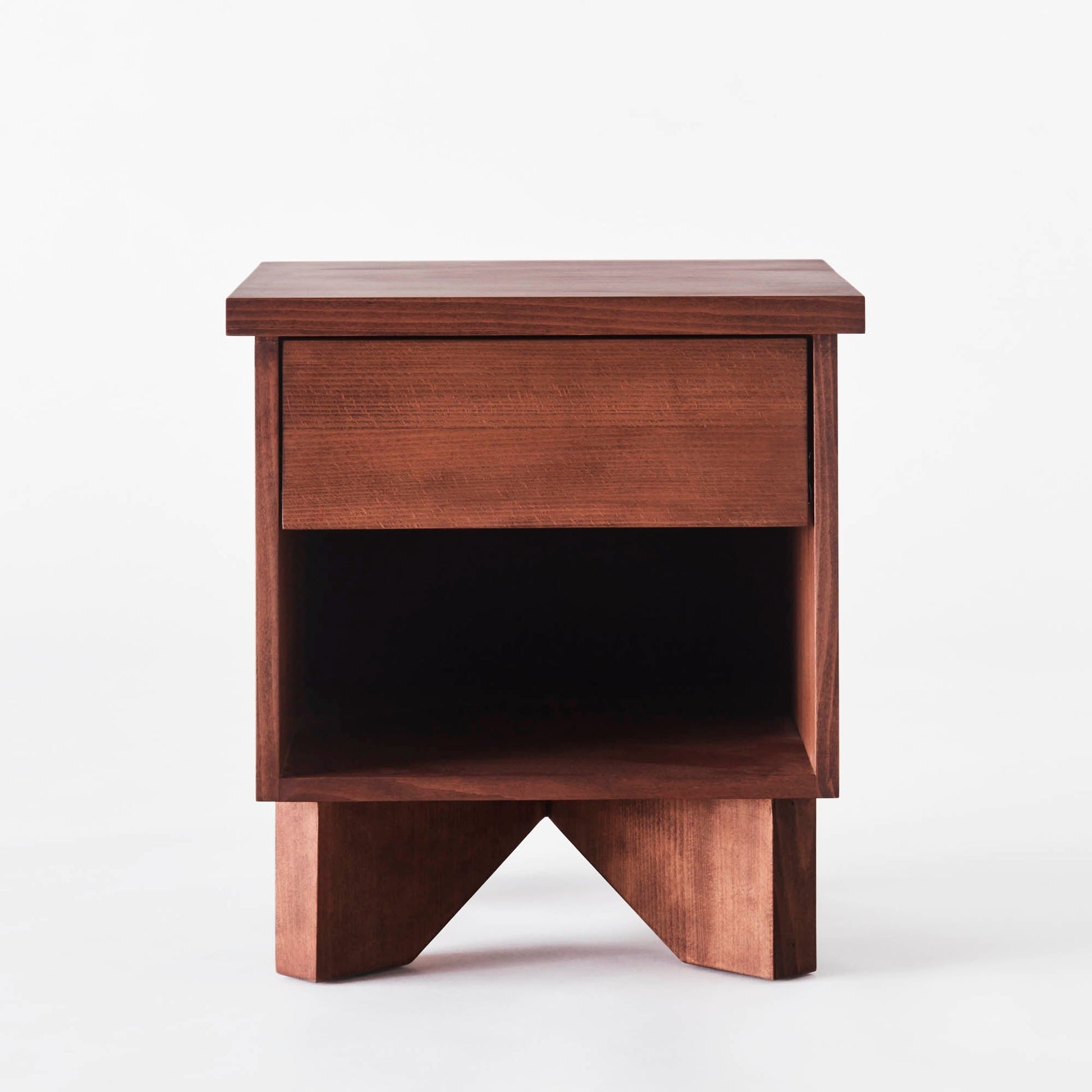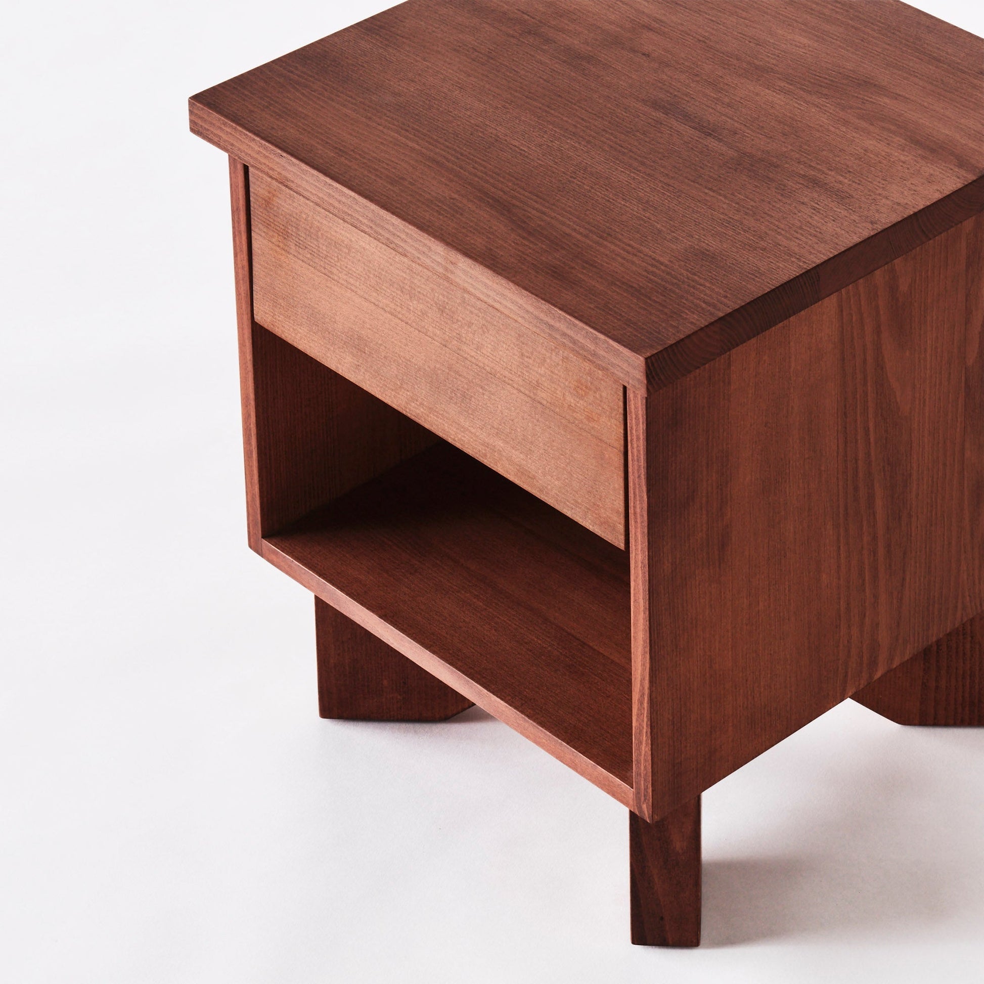 V Bedside Table Beech is a multi-purpose table made of solid beech. With a lot of storage, this table is just as functional in your bedroom next to a bed, as in the living room next to an armchair or sofa. The bedside table in beech has been stained and oiled to receive a matte finish. In addition to this beech version, the table is also available in walnut.
