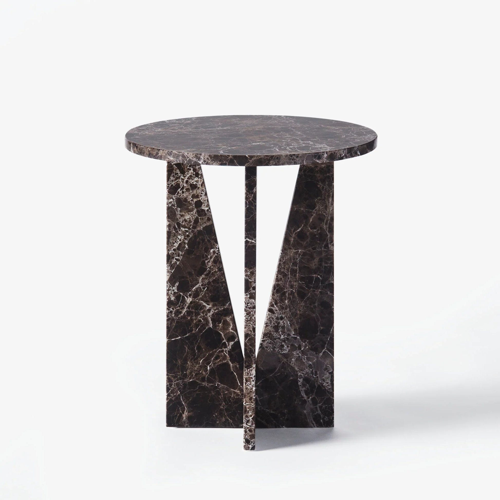 V Side Table is a table made of solid marble in dark emperador. The round tabletop rests on a base consisting of triangular legs that together creates a V-shape. The table is handcrafted by skilled carpenters with extensive experience.